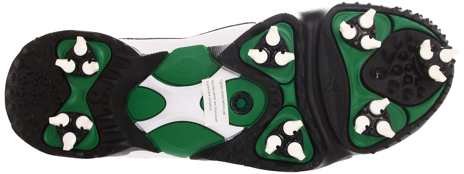 Impress ‘em with your form and your fashion sense in PUMA’s Jigg golf shoe. A water-resistant leather upper keeps your foot dry when you need it, while bold logo detailing adds some visual interest to the greens. Its rubber spikey sole provides superior traction and stability with every stroke.